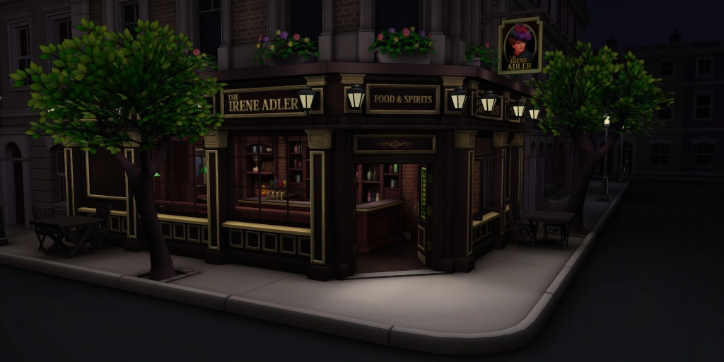 Pub is a SpyParty map, inspired by traditional London pubs. It is notable for having all its conversation circles outside on the sidewalk, and for being the first map released where Toby acts as a bartender instead of a waiter. The pub is named The Irene Adler, which is a reference to a notable character in the Sherlock Holmes short story, "A Scandal in Bohemia." Ms. Adler is held in high esteem by Holmes as a woman of intelligence and resourcefulness, and after his encounter with her is always referred to by the respectful title of the woman. It is also a reference to a well-known pub in London called The Sherlock Holmes.